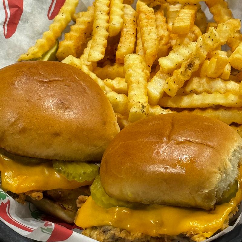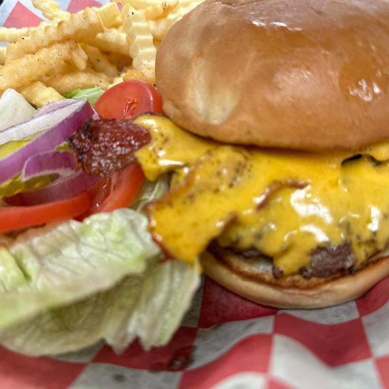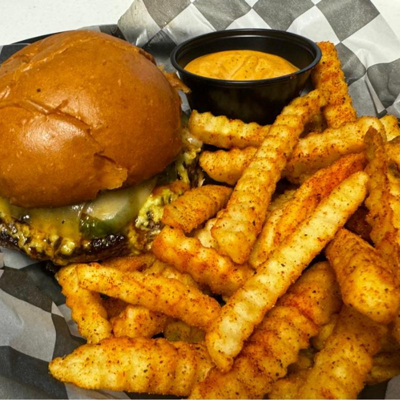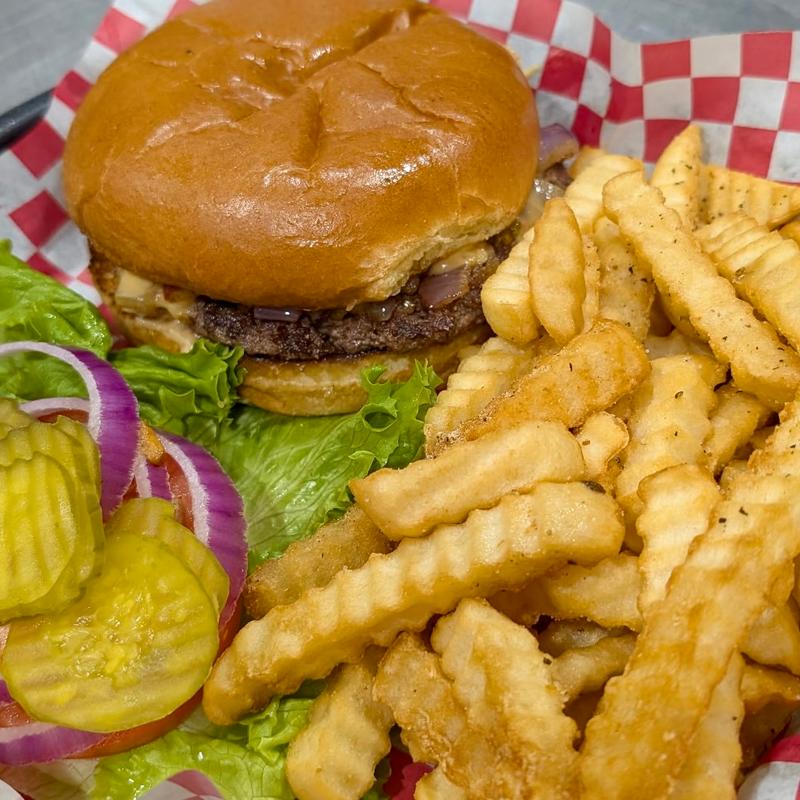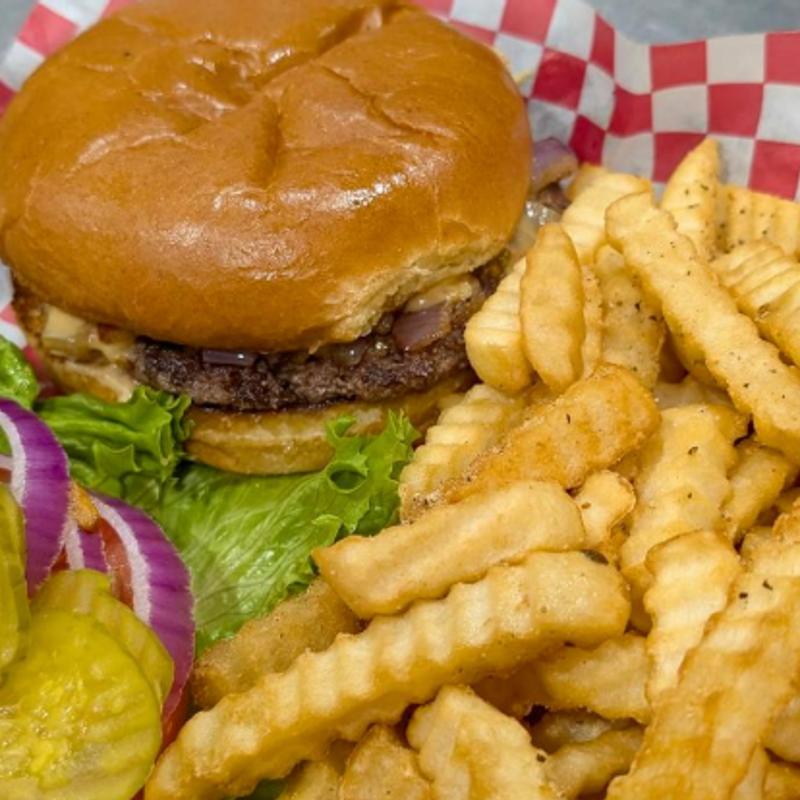 Served with a drink and choice of French fries, homemade crispy onion rings, tater tots, waffle fries, or sweet potato fries with fry sauce