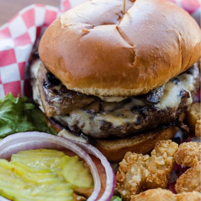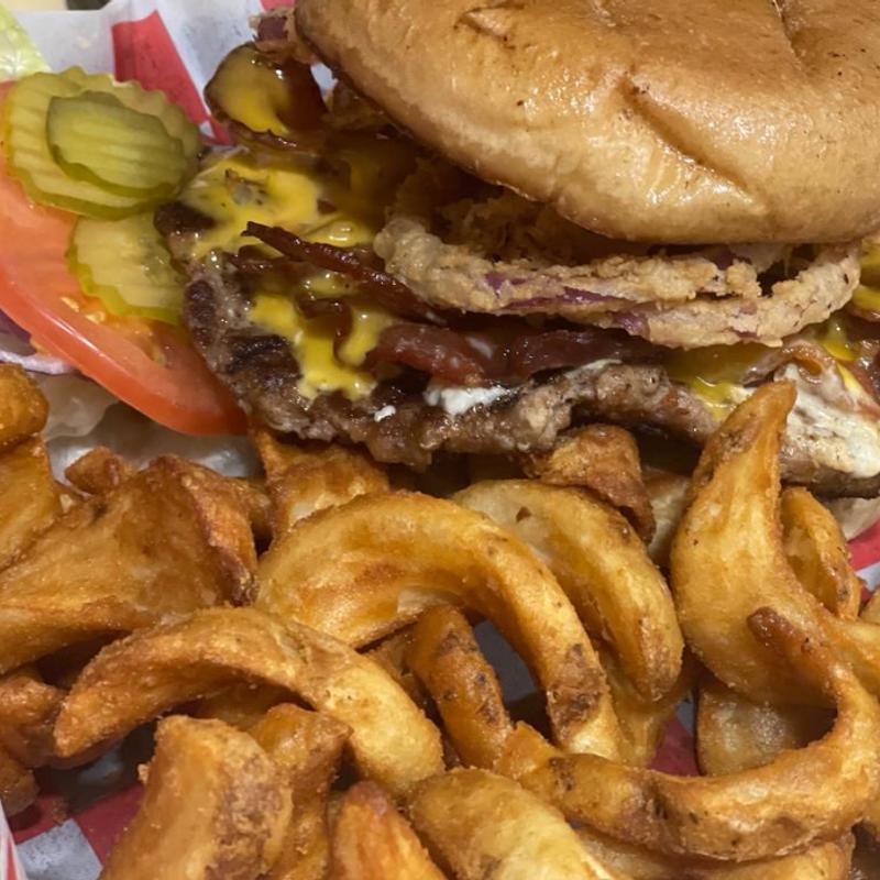 All burgers are made with ½ lb. premium ground chuck and served with a choice of French fries, waffle fries, tater tots, homemade crispy onion rings, sweet potato fries, or Lays chips with fry sauce