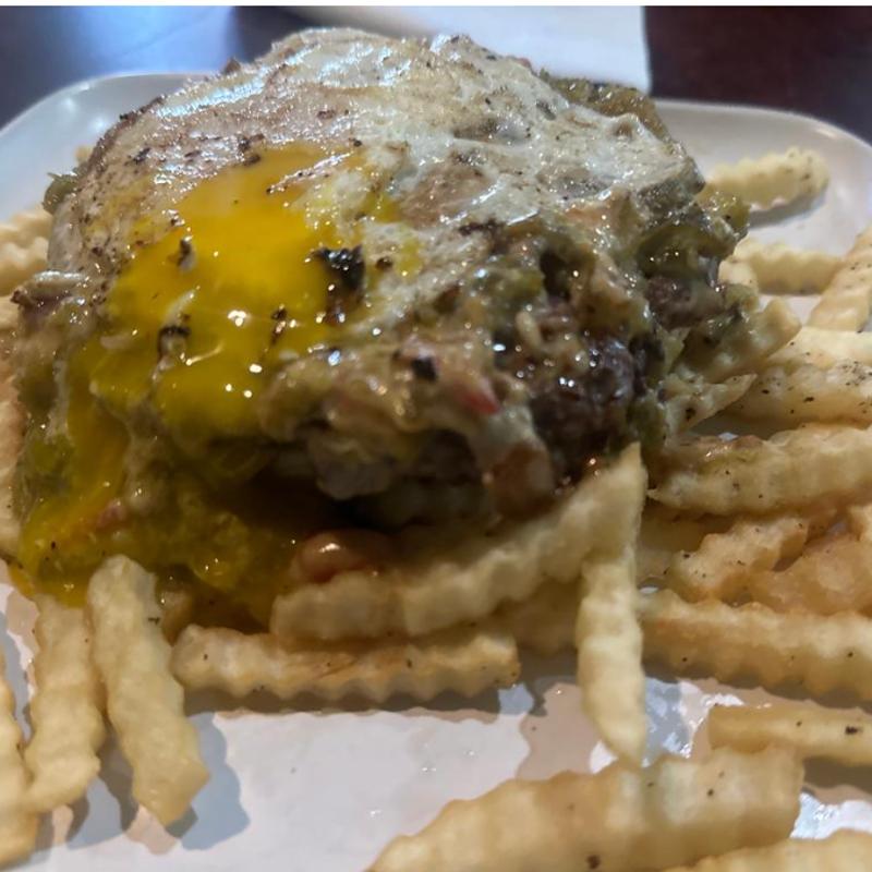 Choice of fries topped with a bottom bun, hamburger patty, grilled onion, green chile, queso, choice of warm green sauce or red chile sauce, egg, and fried jalapeños