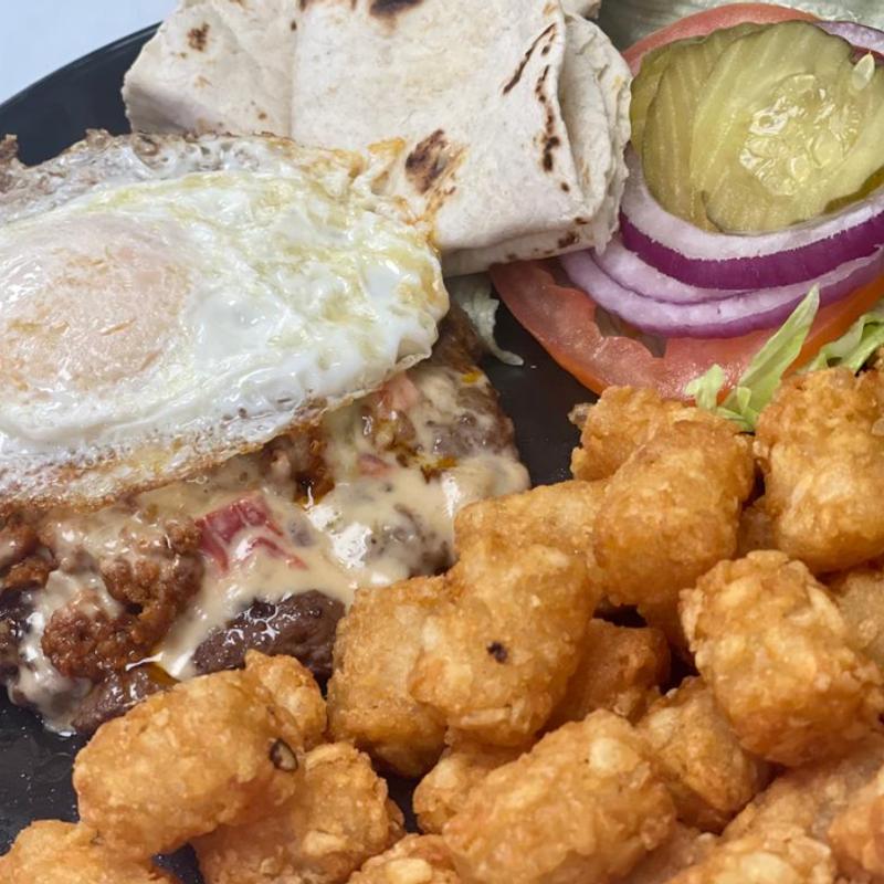 Choice of two flour tortillas or a hamburger bun, beef patty, chorizo, queso, and egg