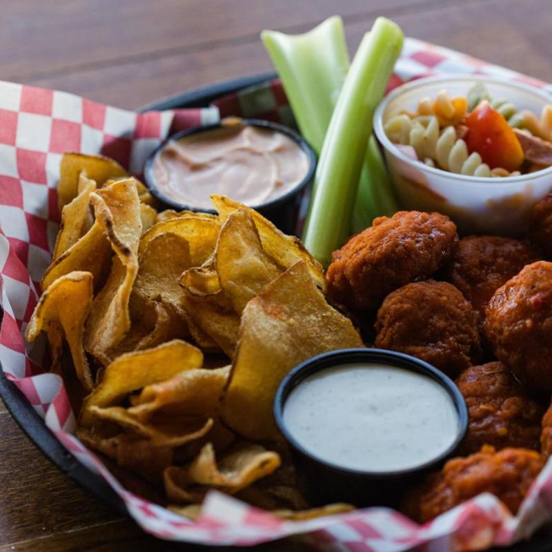 Pasta with shredded chicken tossed in our buffalo mild sauce, topped with diced celery, fried jalapeños, bacon, toasted panko, and drizzled with ranch
