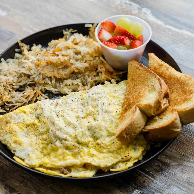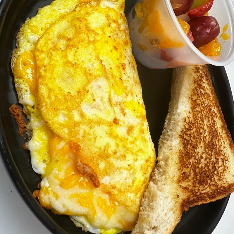 Cheese omelette served with toast & green chile tater bombs or pan-fried potatoes, with a side of fresh fruit • Each Additional Option +$0.50