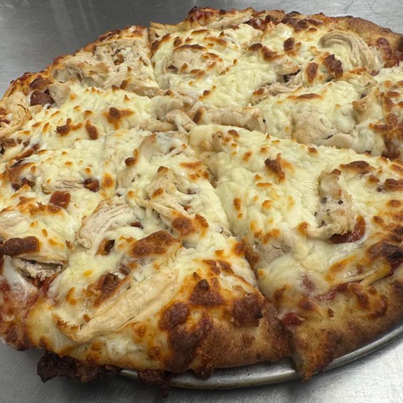 Small $10.00 | Medium $15.00 | Large $17.00 • Garlic white base topped with mozzarella, chicken breast, bacon, and spinach