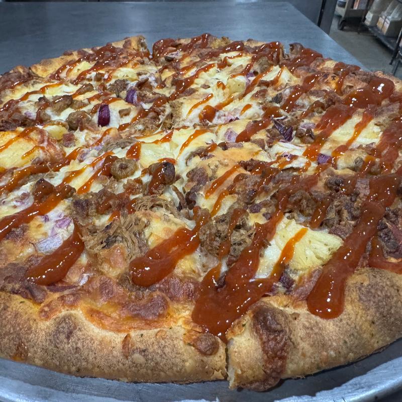 Small $10.00 | Medium $15.00 | Large $17.00 • Marinara base topped with mozzarella, bacon, pulled pork, sausage, red onion, and pineapple. Drizzled with a choice of sweet sriracha sauce or BBQ sauce
