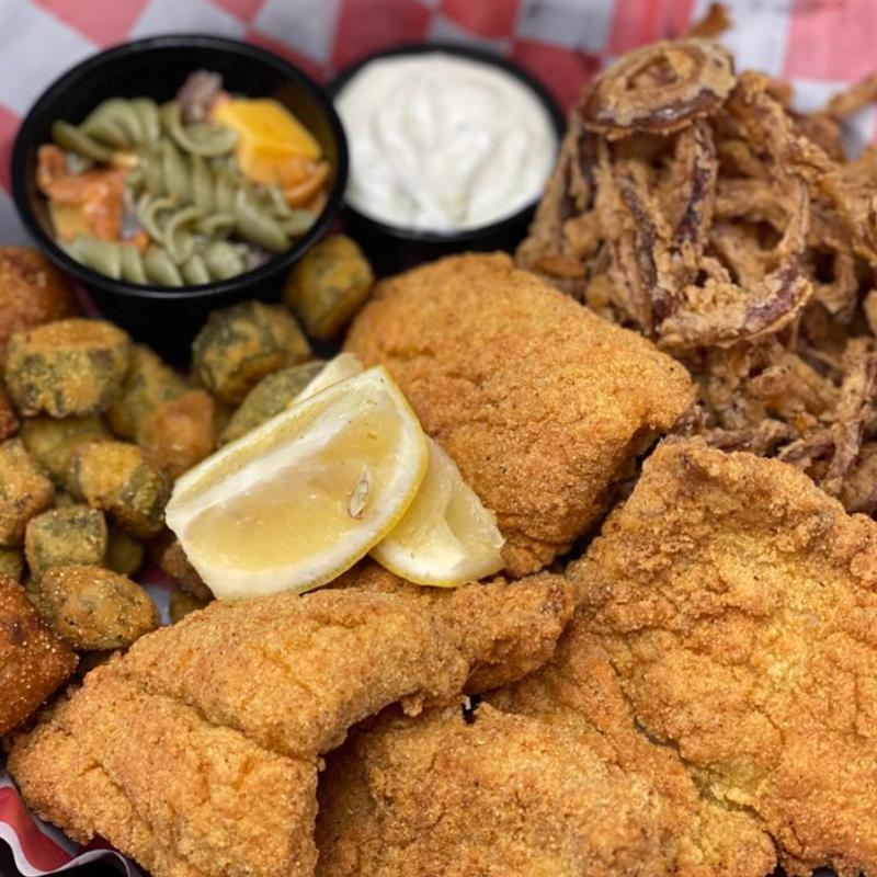 4 breaded catfish served with hushpuppies and fried okra