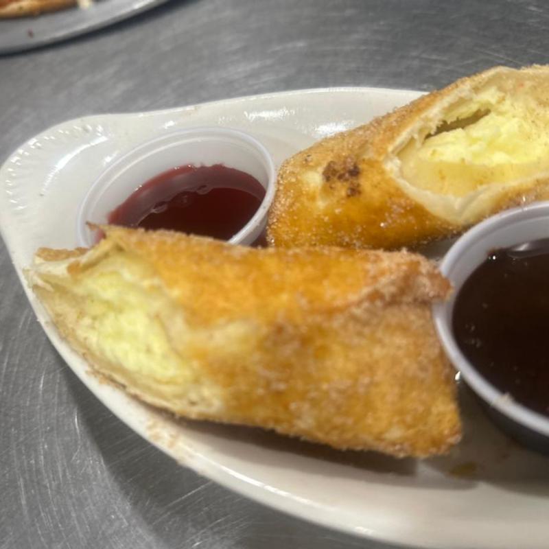 Golden fried sandwich filled with Swiss cheese, turkey, ham, and cheddar cheese, dusted with powdered sugar. Served with raspberry preserves
