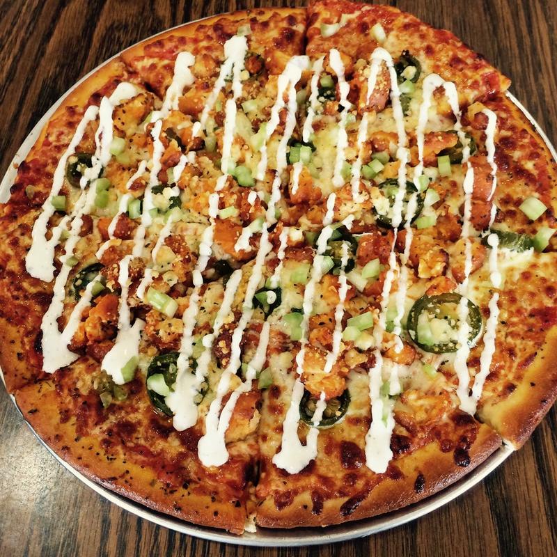 Small $10.00 | Medium $15.00 | Large $17.00 • Mild buffalo sauce and marinara base topped with blue cheese crumbles, mozzarella cheese, breaded chicken tossed in our mild buffalo sauce, and pickled jalapeños. Finished with celery and ranch drizzle