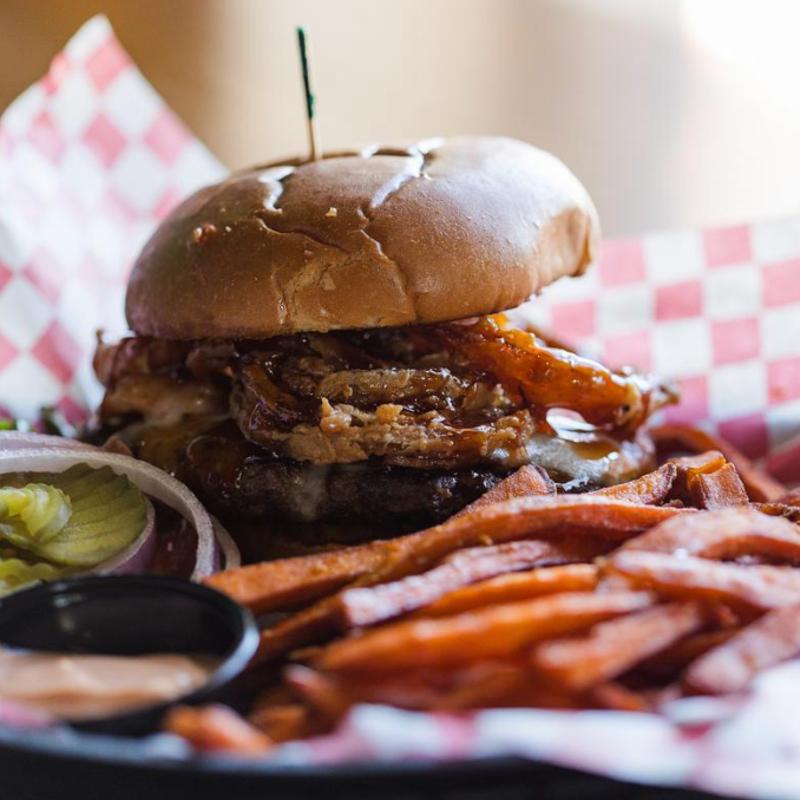 Pepper jack cheese, bacon, and crispy onions drizzled with a spicy bourbon sauce