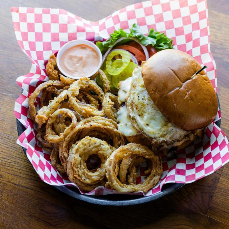 Fried egg, bacon, fried pickles, pepper jack cheese, and caramelized onions drizzled with sriracha ranch