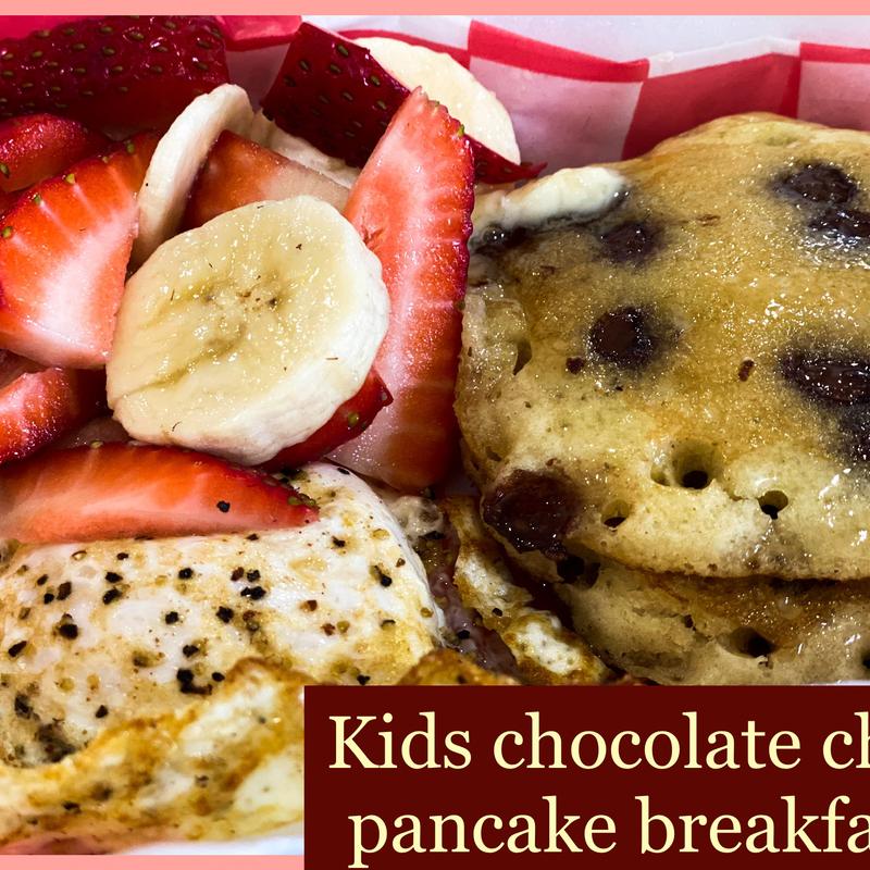 Two eggs, green chile tater bombs or pan-fried potatoes, choice of meat & two sweet crème pancakes