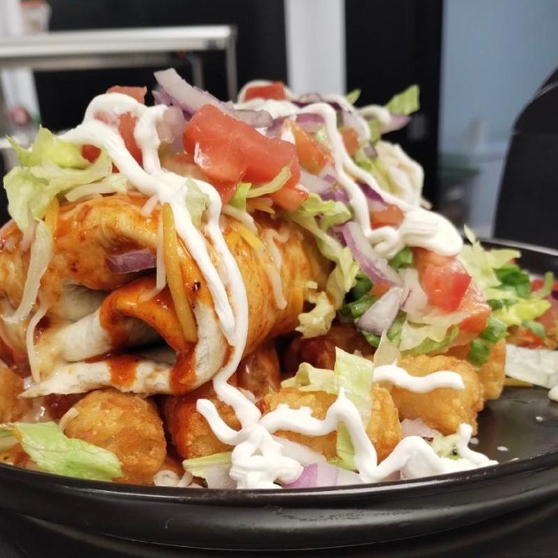 Half $8.00 | Full $14.00 • Tater tots, shredded Colby Jack cheese, shredded chicken tossed in mild buffalo sauce, queso, fried jalapeños, and diced celery, drizzled with ranch • Substitute for Hot Tots – Tossed in our Hot Buffalo Sauce | Substitute for Flamin’ Tots – Tossed in our Fire in the Hole Sauce | Must sign waiver to substitute for Flamin’ Tots