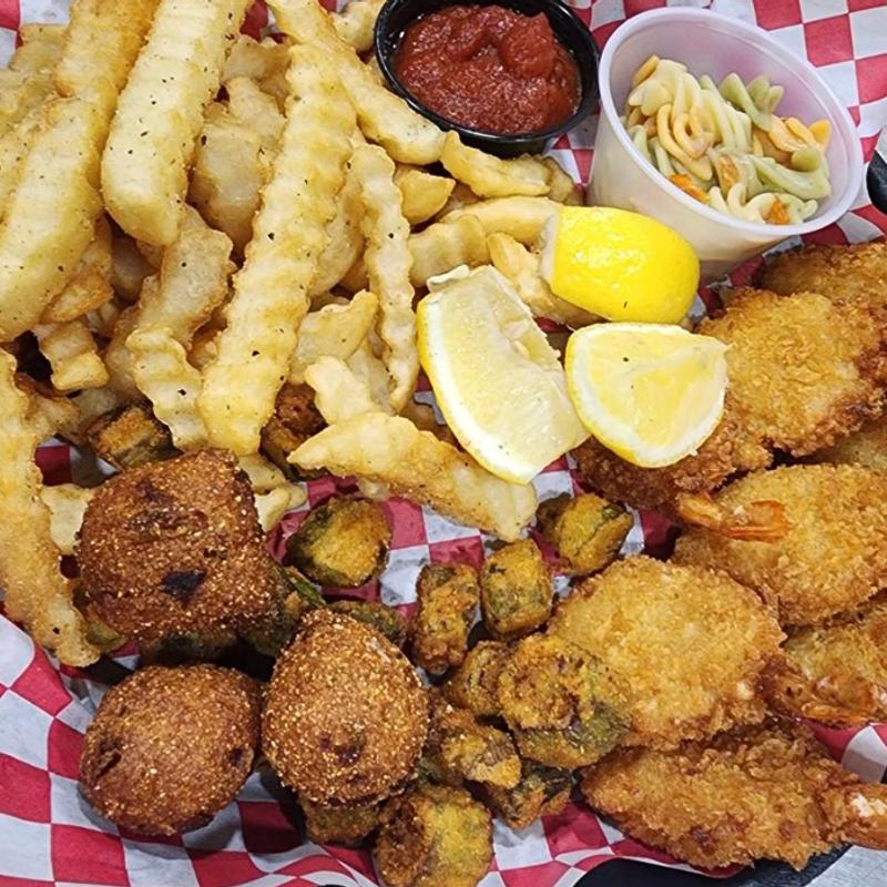 8 golden fried shrimp served with hushpuppies and fried okra